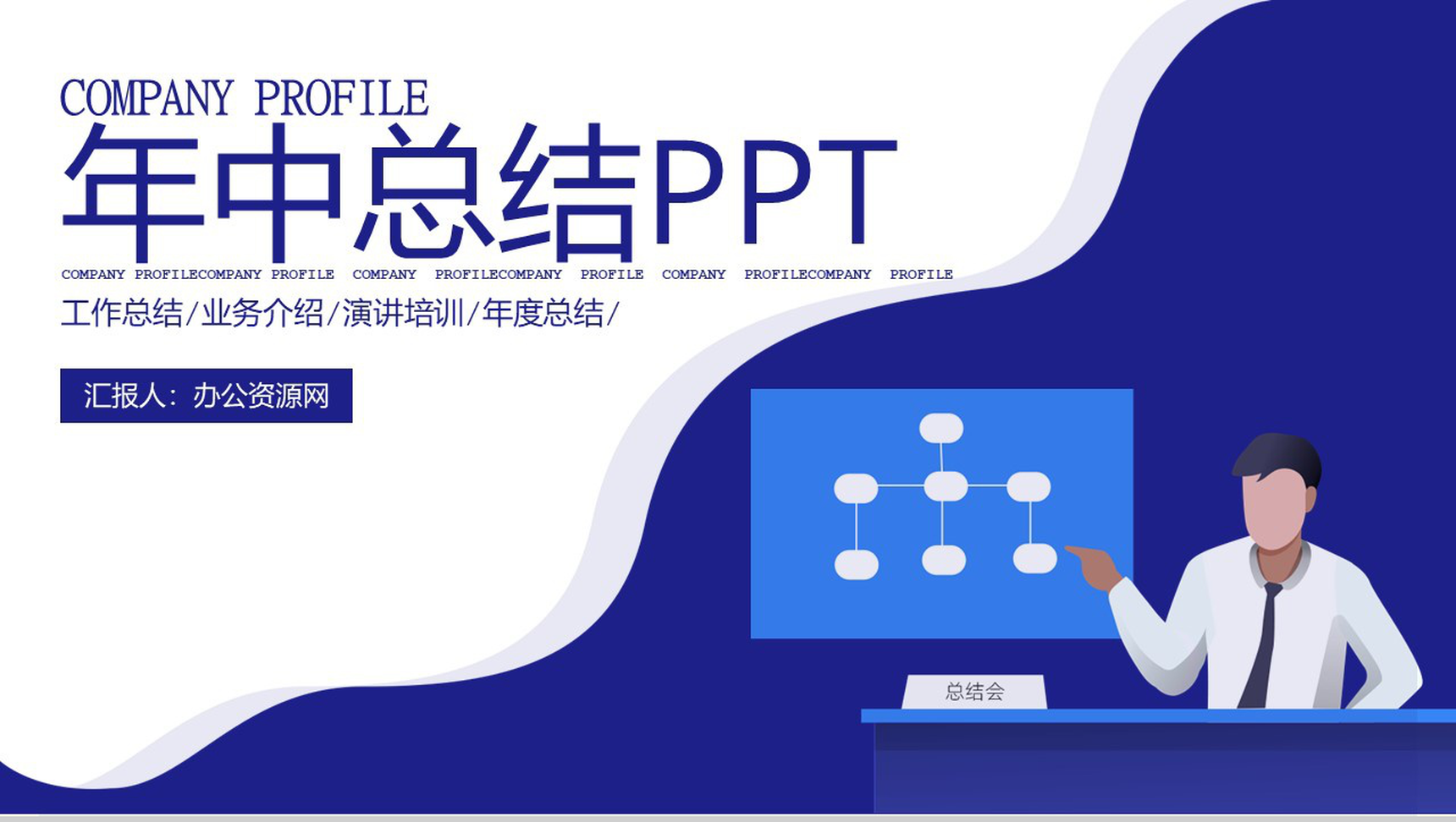 蓝色扁平化2.5D设计年中总结演讲培训PPT模板